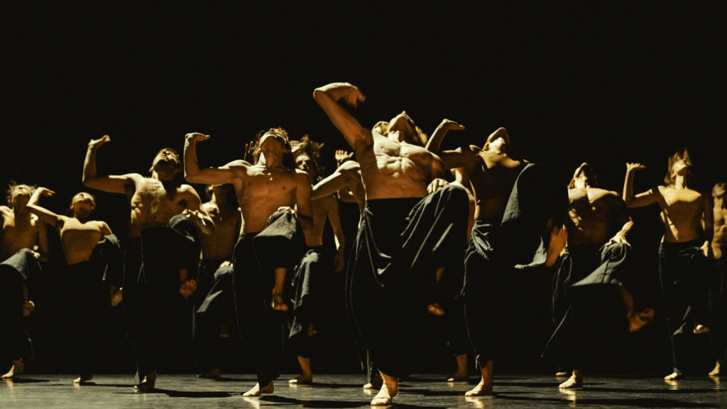 Vijftien dansers met ontbloot bovenlijf staan in een perfecte driehoek op het podium. Elke zijde telt 5 dansers, elke punt één. De haast rituele dans die ze uitvoeren is er een van eindeloze herhaling. De klap die de dansers zichzelf geven zet een hele serie van ronde en toch krachtige bewegingen in gang. De stromende lichamen blijven synchroon, vormen een patroon, en roepen daardoor de associatie op van monniken op binnenplaatsen van Chinese boeddhistische kloosters of grote groepen tai chi-beoefenaars die als één lichaam de ruimte vullen. Na vijf of zes minuten begin ik te snakken naar een individu, naar iemand die zich losmaakt uit deze perfecte driehoek. Het gebeurt niet. Na tien minuten ben ik blij dat een van de dansers een keertje nét iets later dan de rest zijn draai maakt en zijn bewegingssequentie net iets later voltooit. Het is duidelijk niet de bedoeling.